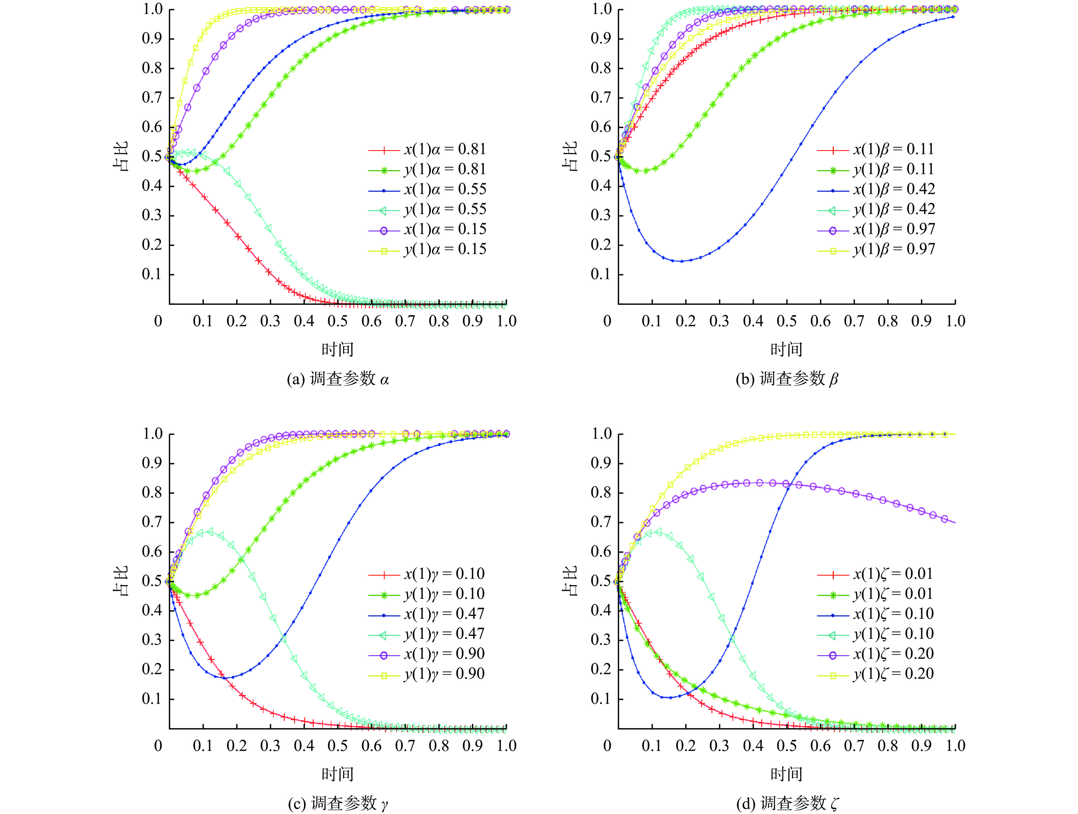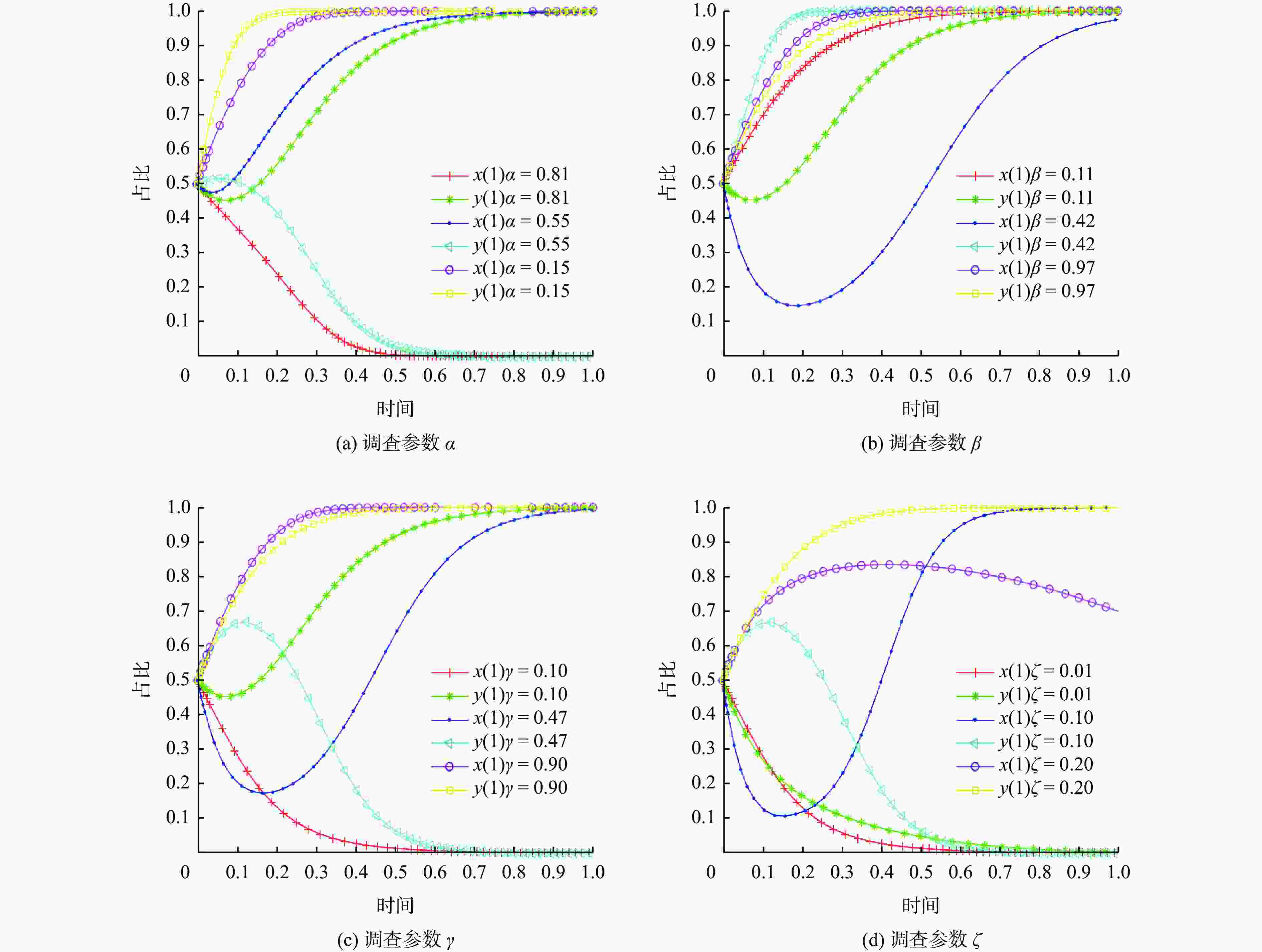 均衡点 Det J TrJ E1(0,0) $ [C_{\mathrm{\mathrm{e}}}+(1-\alpha)B]\left\{\beta C+\gamma S+\zeta[(1+\beta)C+(1+\gamma)S-D]\right\} $ $ \left\{\beta C+\gamma S+\zeta[(1+\beta)C+(1+\gamma)S-D]\right\} $$ + [{C_{\mathrm{e}}} + (1 - \alpha )B] $ E2(0,1) $ -[C\mathrm{_{\mathrm{\mathrm{e}}}}+(1-\alpha)B]\left\{\gamma S+C\mathrm{_{\mathrm{\mathrm{e}}}}+\zeta[C+(1+\gamma)S-D]\right\} $ $ \left\{\gamma S+C_{\mathrm{e}}+\zeta[C+(1+\gamma)S-D]\right\} $$ - [{C_{\mathrm{e}}} + (1 - \alpha )B] $ E3(1,0) $ -\left\{\beta C+\gamma S+\zeta[(1+\beta)C+(1+\gamma)S-D]\right\} $$ [{C_{\mathrm{e}}} + (1 - \alpha )B - L + \beta C] $ $ -\left\{\beta C+\gamma S+\zeta[(1+\beta)C+(1+\gamma)S-D]\right\} $$ + [{C_{\mathrm{e}}} + (1 - \alpha )B] $ E4(1,1) $ [C\mathrm{_{\mathrm{e}}}+(1-\alpha)B-L+\beta C]\left\{\gamma S+C_{\mathrm{\mathrm{e}}}+\zeta[C+(1+\gamma)S-D]\right\} $ $ -\left\{\gamma S+C\mathrm{_{\mathrm{e}}}+\zeta[C+(1+\gamma)S-D]\right\} $$ - [{C_{\mathrm{e}}} + (1 - \alpha )B - L + \beta C] $ E5(x0,y0) $ -x_0y_0(1-x_0)(1-y_0)(\beta C-L)\left[C_{\mathrm{e}}-(1+\zeta)\beta C\right] $ 0 表 4 关键参变量取值