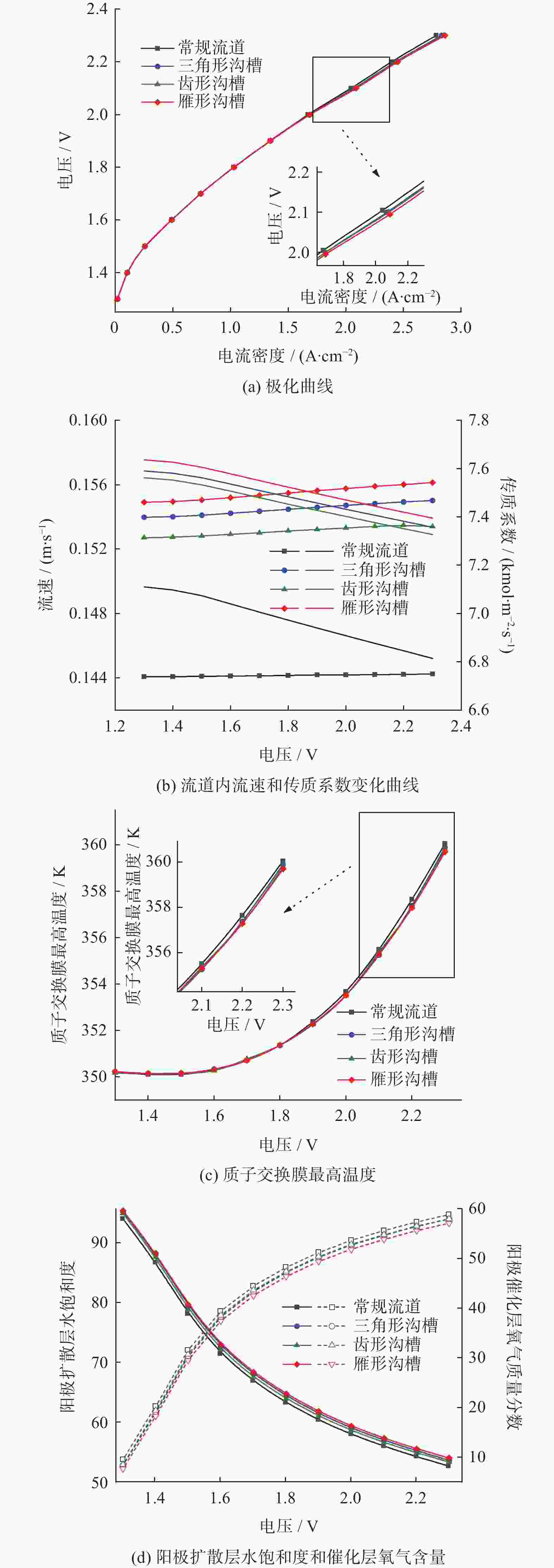 沟槽布置方案 电势/V 阳极扩散层水饱和度/% 阳极扩散层氧气含量/% 质子交换膜最高温度/K 阳极流道