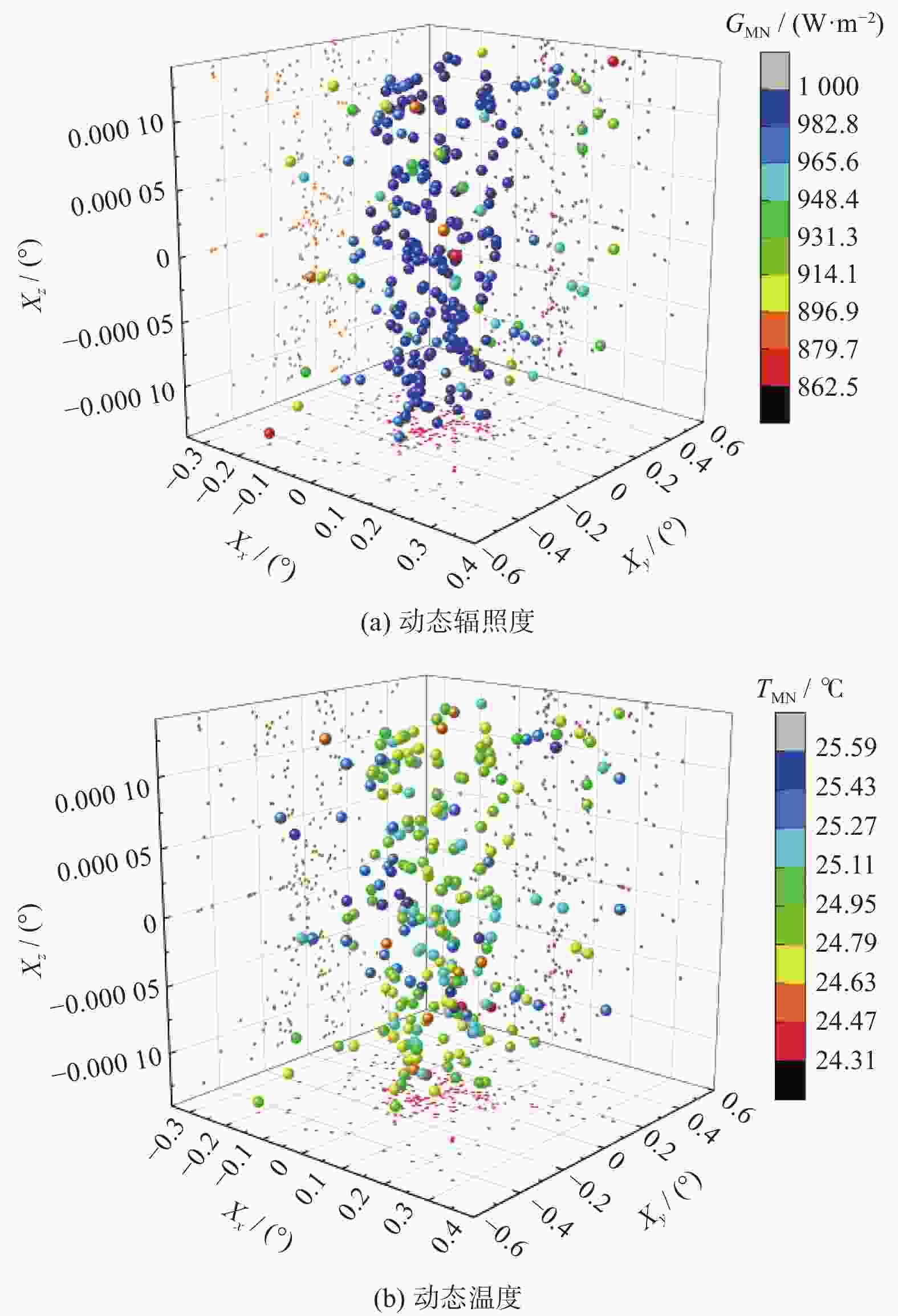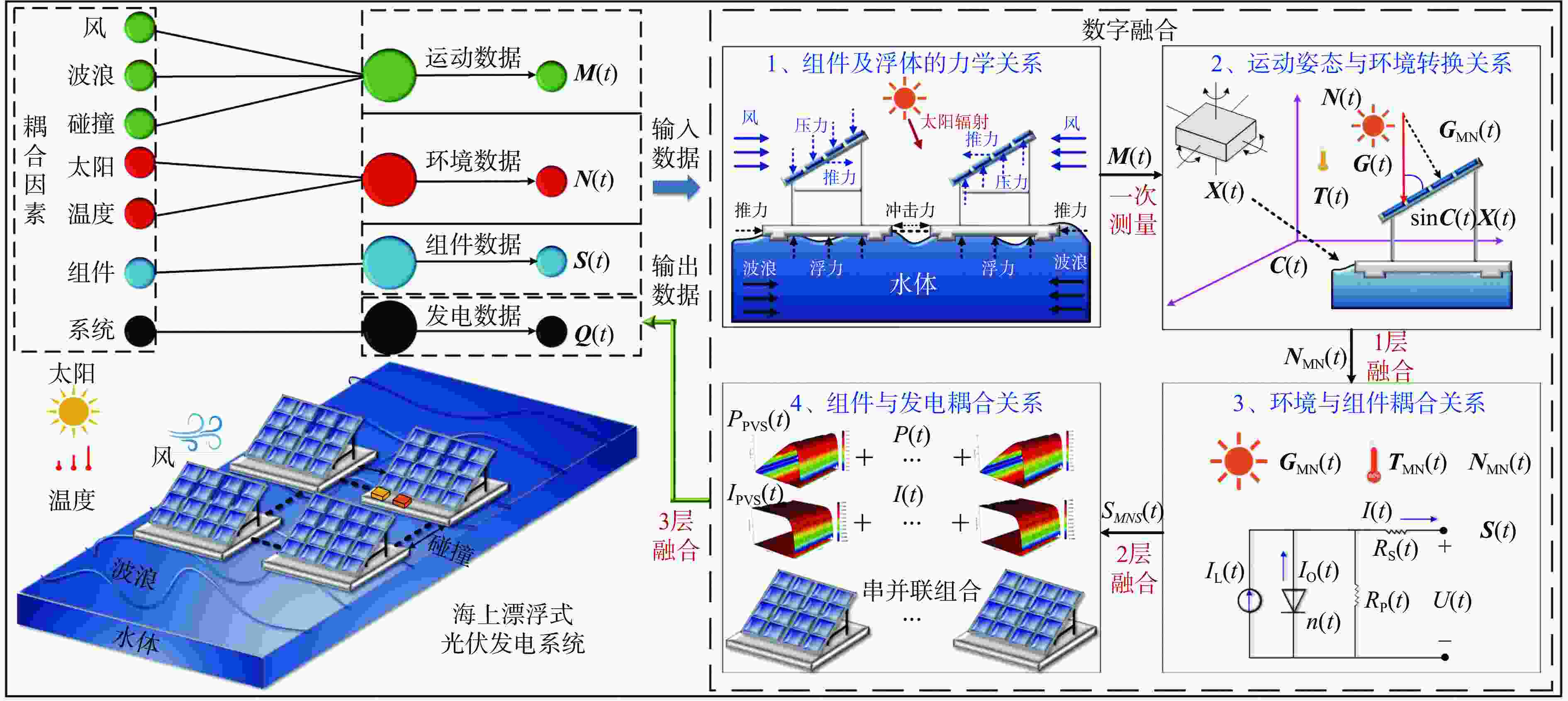 摘要: 相比陆基式光伏发电系统,海上漂浮式光伏系统发电耦合了运动特征,输出功率呈现复杂随机性。为获取海上漂浮式光伏系统的发电运动特征,提出一种“一次测量三层融合”的数字化方法,即利用运动、环境、组件和发电数据表征系统耦合因素,通过测量获取运动数据,依次实现运动到环境、环境到组件、组件到发电的三层数据融合,并通过搭建实验系统,验证数字融合方法的有效性。结果表明,与实测数据相比,融合方法的最大偏差为1.11 W,最大相对偏差为1%。相较于静态时,运动造成系统整体功率减少1.14 W,降低5.06%;功率最大减少3.27 W,最大降低13.30%,为提高海上漂浮式光伏发电效率提供了有效途径。Abstract: Compared with land-based photovoltaic (PV) power generation systems, offshore floating PV systems are coupled with motion characteristics, so the output power displays complex randomness. To obtain the motion characteristics of offshore floating PV power generation, a digital method "one measurement and three-layer fusion" was proposed. Data regarding motion, environment, components, and power generation were utilized to characterize the systems' coupling factors. Motion data were acquired through measurement, and data fusion was sequentially realized from motion to environment, environment to components, and components to power generation. Finally, an experimental system was constructed to validate the method. The results indicate that the maximum absolute deviation and relative deviation between the fusion data and the data from measurement were 1.11 W and 1%, respectively. Moreover, compared with the static state, the motion leads to an overall power reduction of 1.14 W (5.06%), with a maximum reduction of 3.27 W (13.30%). This method offers an effective approach to improve the efficiency of offshore floating PV power generation.