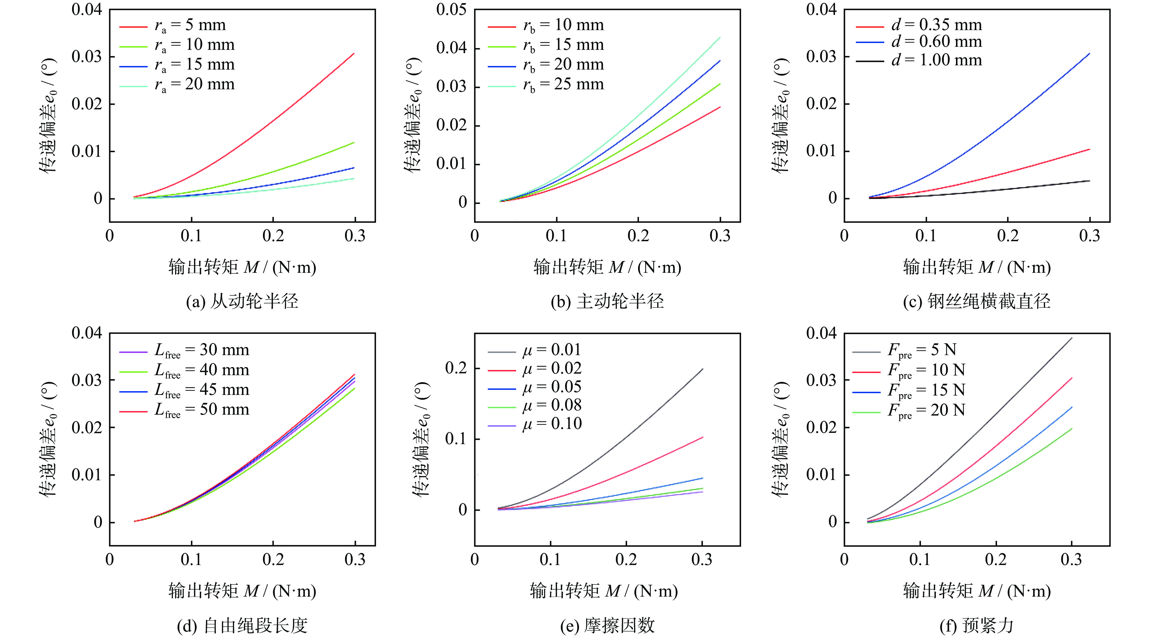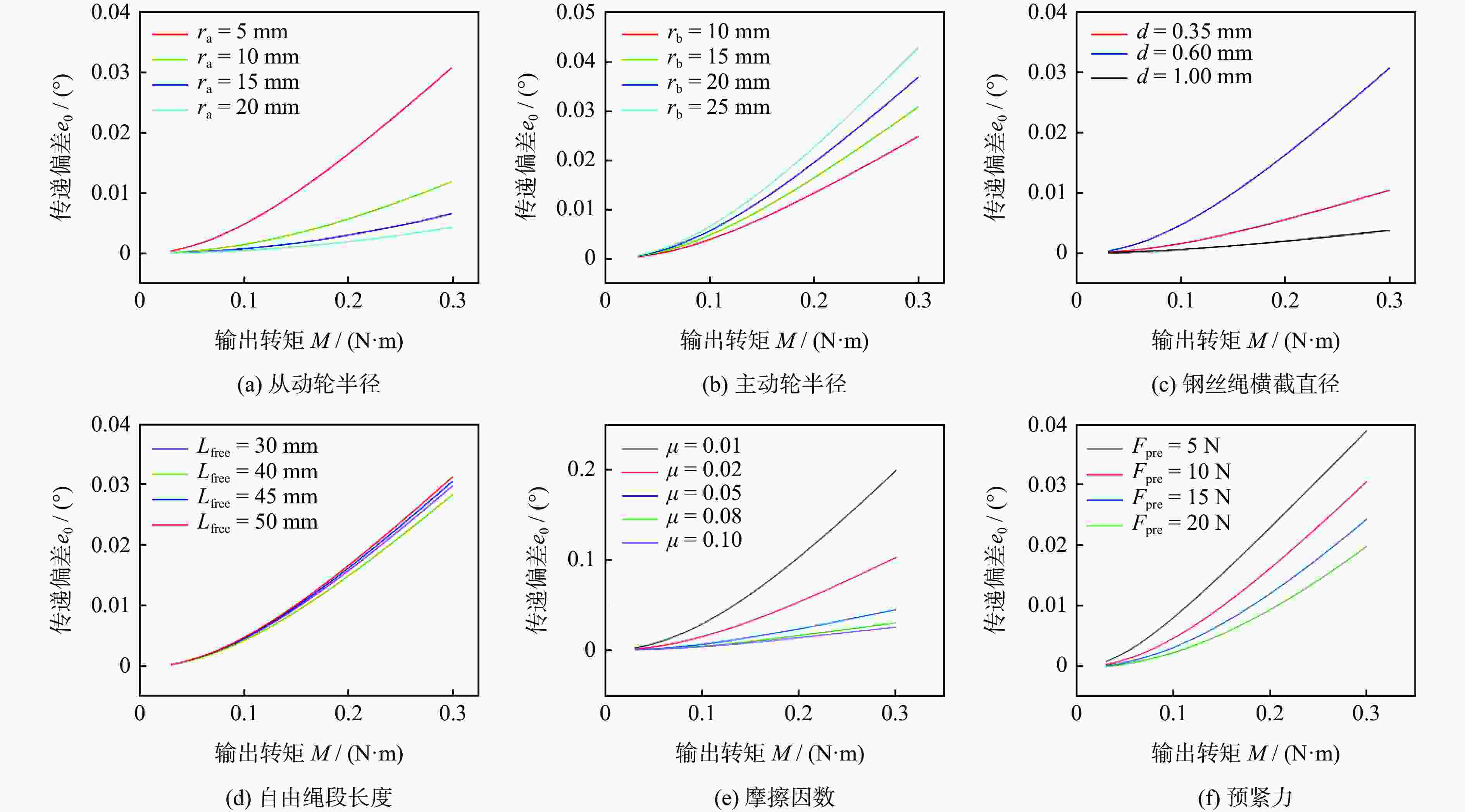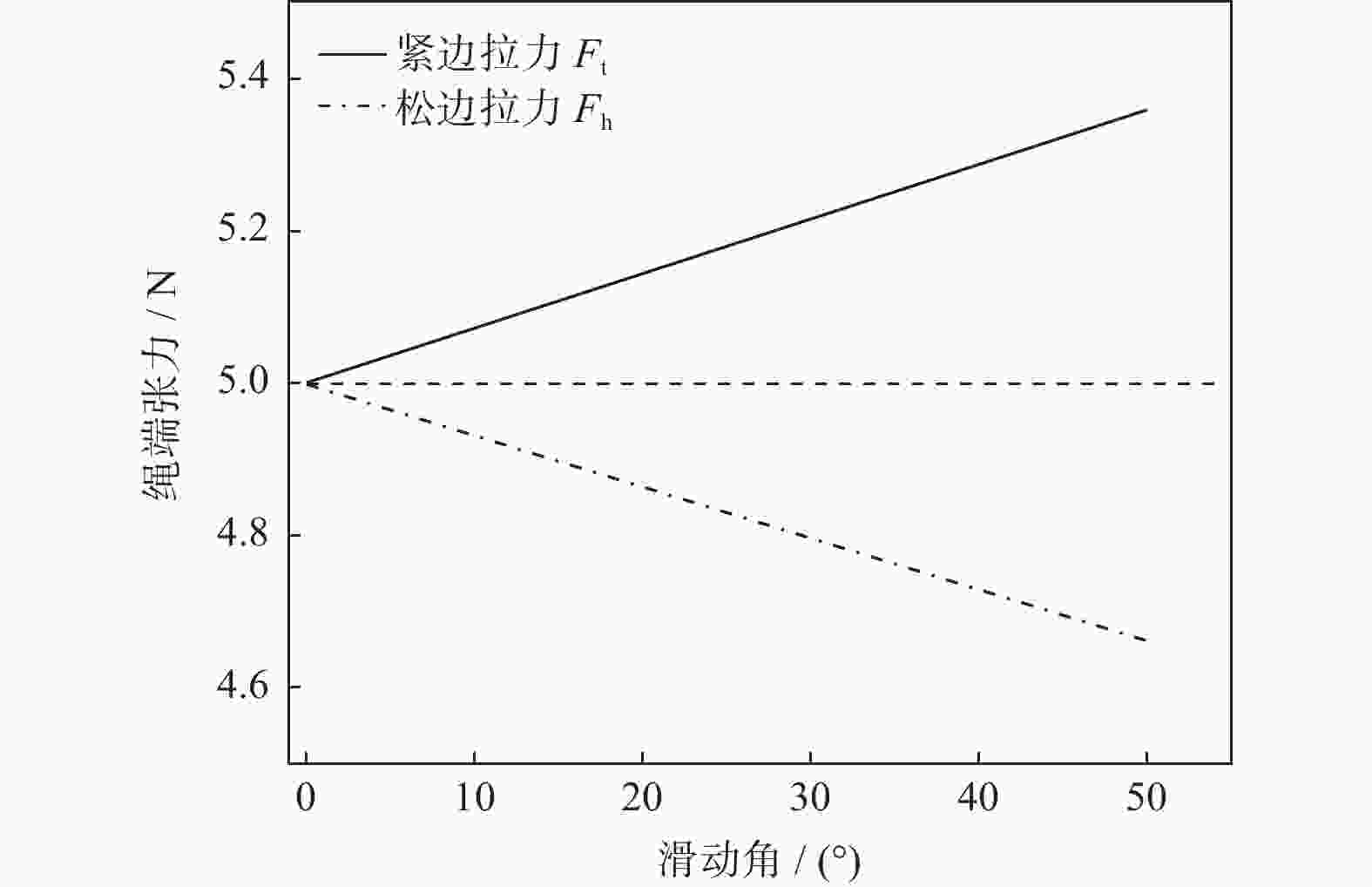符号 参数 数值 ra 从动轮半径/mm 5 rb 主动轮半径/mm 15 Lfree 自由绳段长度/mm 45 A 钢丝绳横截面积/mm2 0.096 162 5e-6 E 钢丝绳弹性模量/GPa 200 表 2 末端执行器旋转角度