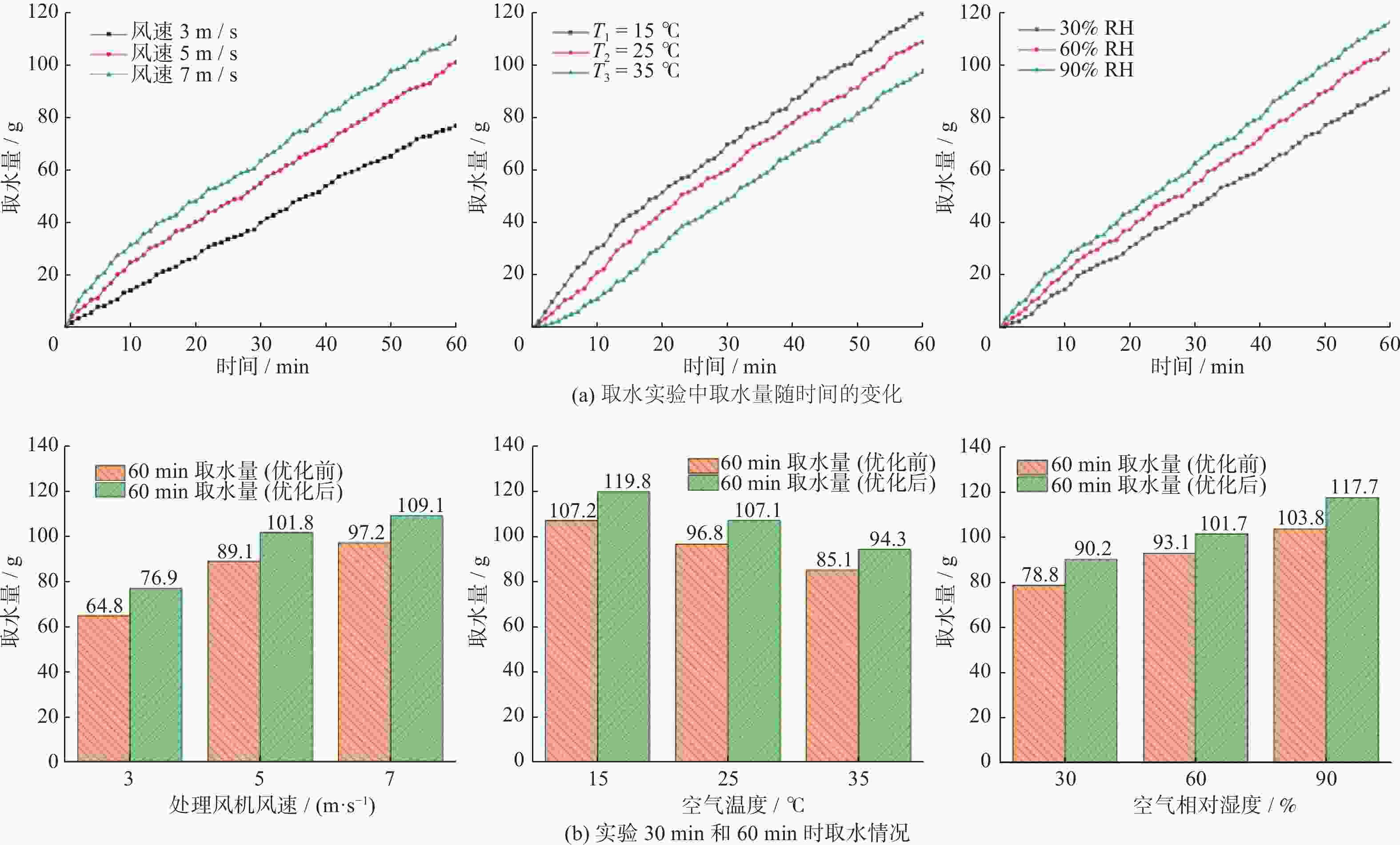 摘要: 实验探究空气取水装置取水效率的影响因素,结果表明处理风机风速、环境空气温度和相对湿度都会影响装置的取水效率。实验中发现,翅片表面的冷凝水产生后未能及时滴落,而是黏附在翅片间形成水桥,这对装置的取水效率产生负面影响。为提高装置的取水效率,对冷凝翅片进行优化。使用COMSOL软件建模进行仿真分析,优化半导体制冷型空气取水装置的冷凝翅片结构,并在翅片表面涂覆疏水性材料,促使冷凝水快速滴落,提高了装置的取水效率。Abstract: An experimental investigation was conducted to explore the factors influencing the water harvesting efficiency of an air-water harvesting device. The results indicate that fan speed, ambient air temperature, and relative humidity significantly affect the performance. During the experiments, it was observed that condensate on the surface of the fins failed to shed promptly. Instead, it adhered between fins and formed water bridges, which negatively affected the water harvesting efficiency. To address this, the condenser fins were optimized. Using COMSOL for modeling and simulation, the fin structure of the semiconductor refrigeration air-water harvesting device was optimized, and hydrophobic materials were coated on the fin surface to facilitate rapid condensate shedding, thereby increasing the device's water harvesting efficiency.