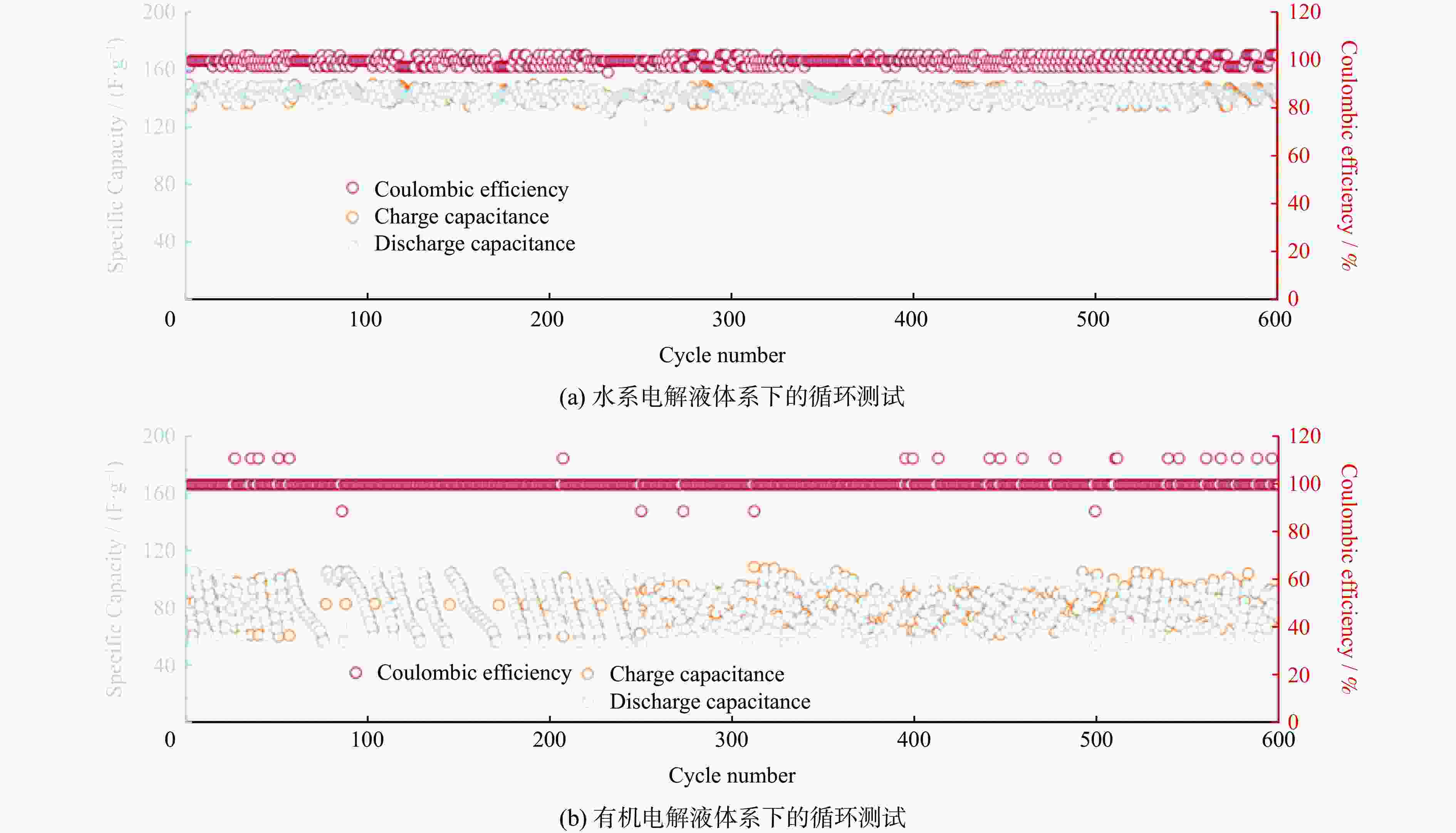 • 摘要: 为应对传统能源的不可持续及相关的环境问题,新能源储能器件日益得到重视。超级电容器因功率密度高、使用寿命长和绿色环保等特点受到广泛关注。以活性炭为阴极,分别在有机和水系电解液中组装CR2032型纽扣电池。在扫描速率为0.1 mV/s时,两种电解液对应的比电容分别为143.44和156.58 F/g;在电流密度为0.1 A/g时,两种电解液对应的比电容分别为79.54和95.92 F/g。有机体系中最大电位窗口达1.8 V;600次循环后,其比电容和库伦循环效率保持率均优于水系,表现出更好的稳定性,但水系的阻抗性能更加优异。