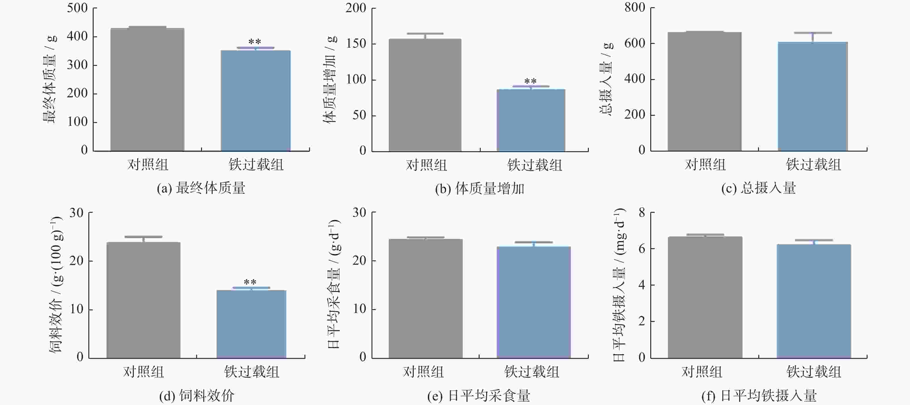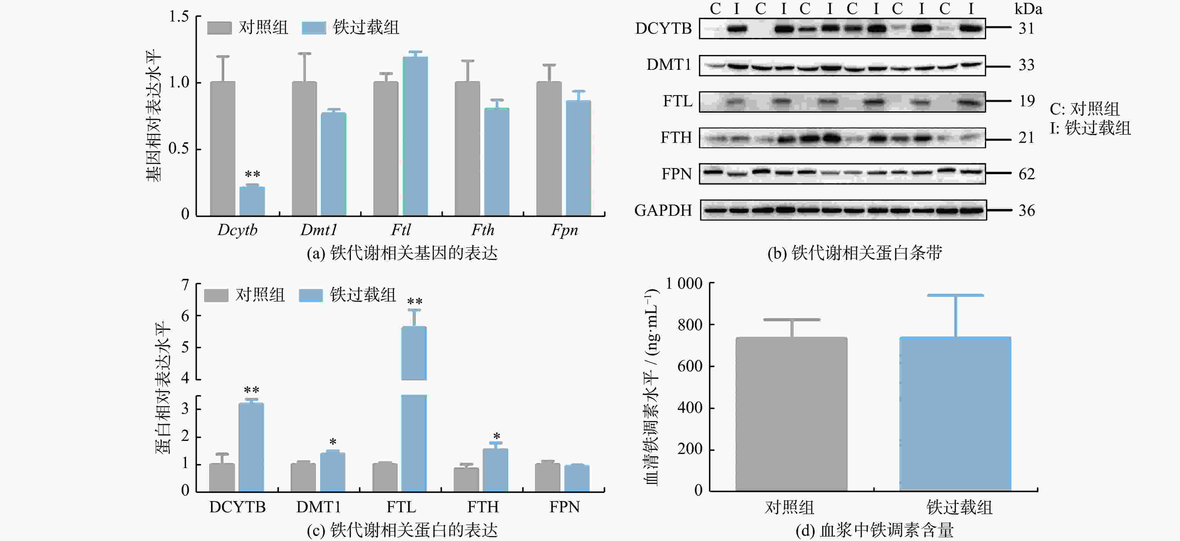 摘要: 铁是维持各种生理功能所必需的微量营养素,但过量的铁因其氧化还原活性具有高度毒性。将6 ~ 7周龄雄性SD大鼠随机分为对照组和铁过载组,分别给予生理盐水和150 mg/kg右旋糖酐铁连续处理4周。结果发现,铁过载显著降低大鼠体质量,增加血清铁、转铁蛋白结合铁、铁蛋白含量和转铁蛋白饱和度。铁过载组大鼠十二指肠、肝脏和脾脏铁含量显著增加,而十二指肠绒毛长度及其与隐窝深度的比值显著下降。此外,铁过载大鼠表现出与吸收和储存相关的DCYTB、DMT1、FTL和FTH的表达上调,但FPN和血清铁蛋白水平没有显著变化。以上结果表明,铁过载通过上调十二指肠铁吸收和储存蛋白表达,诱发十二指肠铁沉积和肠道损伤,为铁过载引起的十二指肠健康问题提供了理论证据。Abstract: Iron is an essential trace element for various physiological functions, yet excessive iron is highly toxic owing to its redox activity property. Male Sprague-Dawley (SD) rats, aged 6~7 weeks were randomly divided into a control group and an iron overload group. They were administered either saline or 150 mg/kg iron dextran for four consecutive weeks. The results show that iron overload significantly reduced body mass and increased serum iron, transferrin-bound iron, ferritin levels, and transferrin saturation. Elevated iron contents were observed in the duodenum, liver, and spleen of iron overloaded rats, whereas duodenal villus length and the villus-length-to-crypt-depth ratio were significantly decreased. Furthermore, an upregulation of DCYTB, DMT1, FTL, and FTH associated with absorption and storage, was observed in iron-overloaded rats, yet no significant changes were found in ferroportin (FPN) or serum ferritin levels. These findings indicate that iron overload induces duodenal iron deposition and intestinal damage by upregulating the expression of duodenal iron-absorption and storage proteins, thereby providing theoretical evidence for duodenal health issues caused by iron overload.